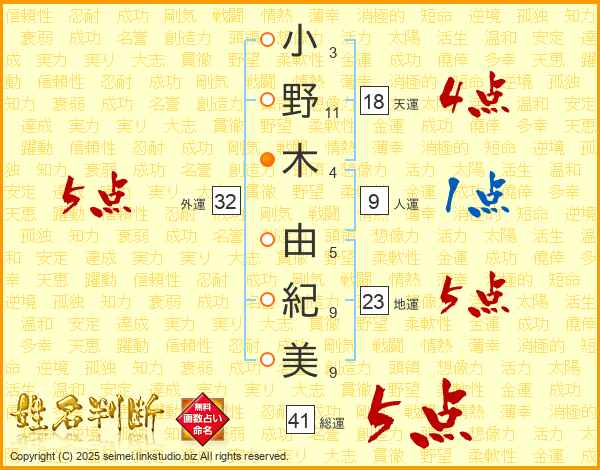 小(3画)野(11画)木(4画) 由(5画)紀(9画)美(9画)