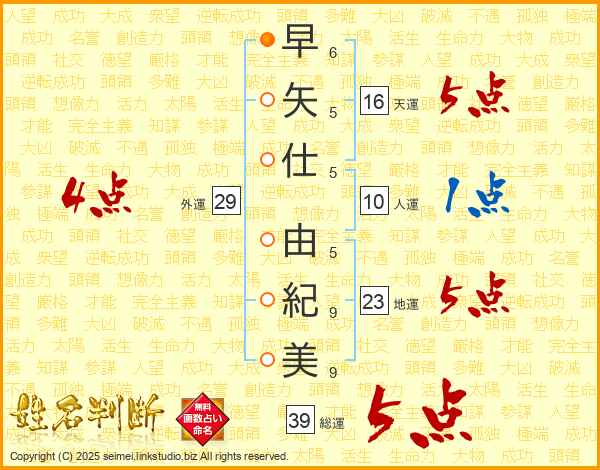 早(6画)矢(5画)仕(5画) 由(5画)紀(9画)美(9画)
