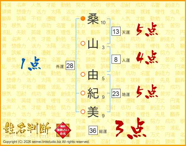 桑(10画)山(3画) 由(5画)紀(9画)美(9画)