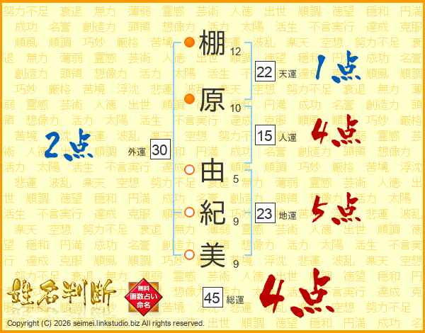 棚(12画)原(10画) 由(5画)紀(9画)美(9画)