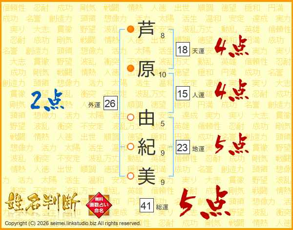 芦(8画)原(10画) 由(5画)紀(9画)美(9画)