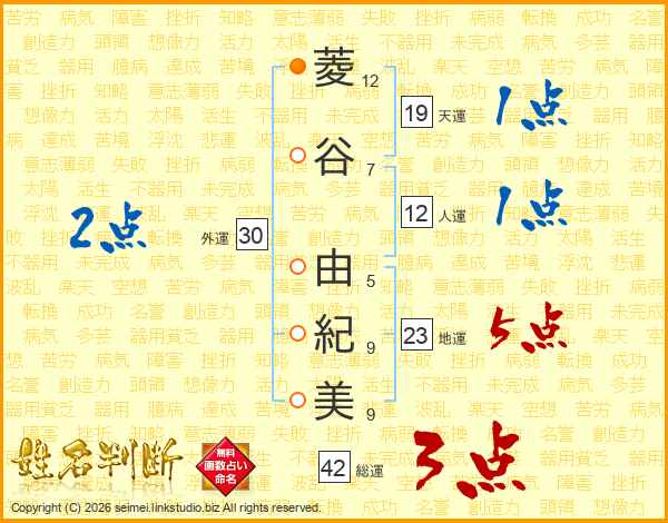 菱(12画)谷(7画) 由(5画)紀(9画)美(9画)