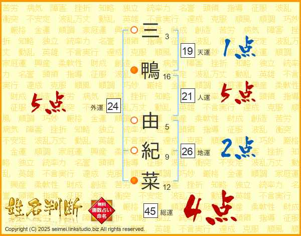 三(3画)鴨(16画) 由(5画)紀(9画)菜(12画)