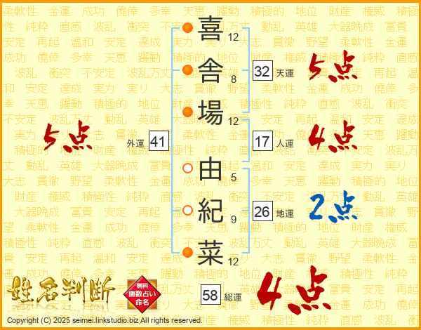喜舎場由紀菜さんの総運は58画の4点!