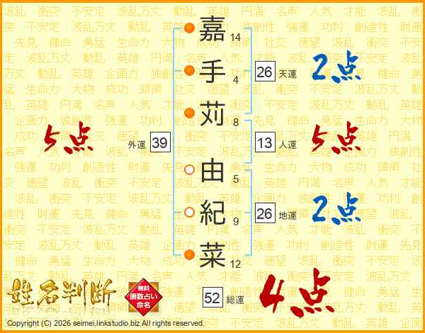 嘉(14画)手(4画)苅(8画) 由(5画)紀(9画)菜(12画)