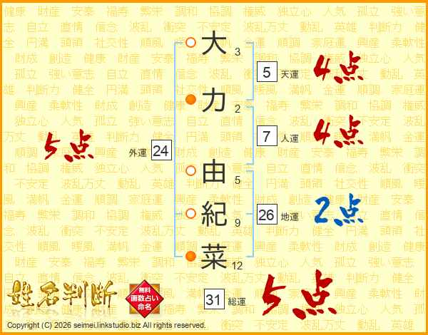 大(3画)力(2画) 由(5画)紀(9画)菜(12画)