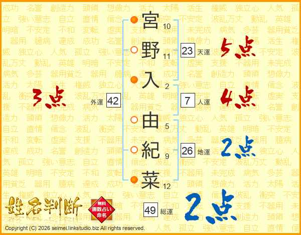 宮野入由紀菜さんの総運は49画の2点!