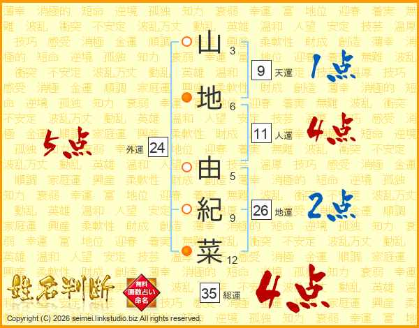 山(3画)地(6画) 由(5画)紀(9画)菜(12画)