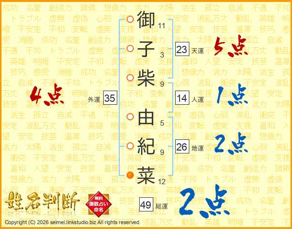 御(11画)子(3画)柴(9画) 由(5画)紀(9画)菜(12画)
