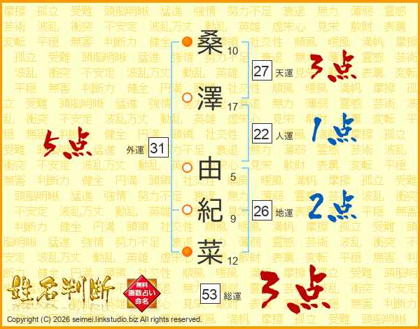 桑(10画)澤(17画) 由(5画)紀(9画)菜(12画)