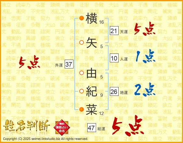 横(16画)矢(5画) 由(5画)紀(9画)菜(12画)