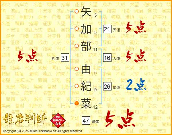 矢(5画)加(5画)部(11画) 由(5画)紀(9画)菜(12画)