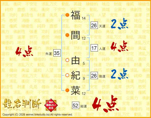 福(14画)間(12画) 由(5画)紀(9画)菜(12画)