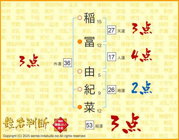 稲冨由紀菜さんの天運は27画の3点!