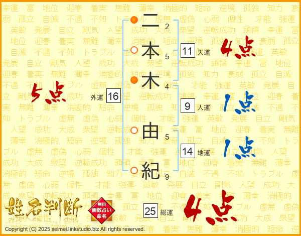 二(2画)本(5画)木(4画) 由(5画)紀(9画)