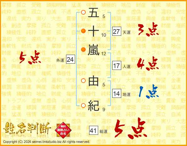 五(5画)十(10画)嵐(12画) 由(5画)紀(9画)