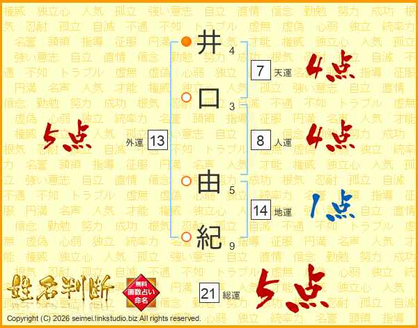 生活面を象徴する運勢です。外部から受ける影響力を表し、結婚運、家庭運や職場、環境への順応性を表します。総運から人運を引いた画数。姓や名が1文字の場合を除く。