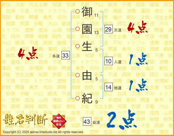 御(11画)園(13画)生(5画) 由(5画)紀(9画)
