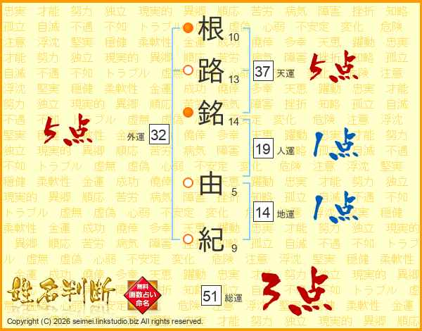 根(10画)路(13画)銘(14画) 由(5画)紀(9画)