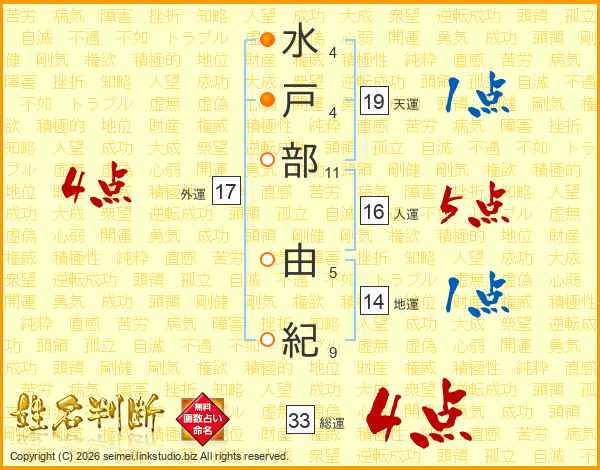水(4画)戸(4画)部(11画) 由(5画)紀(9画)