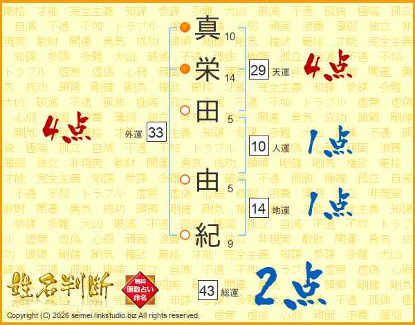真(10画)栄(14画)田(5画) 由(5画)紀(9画)