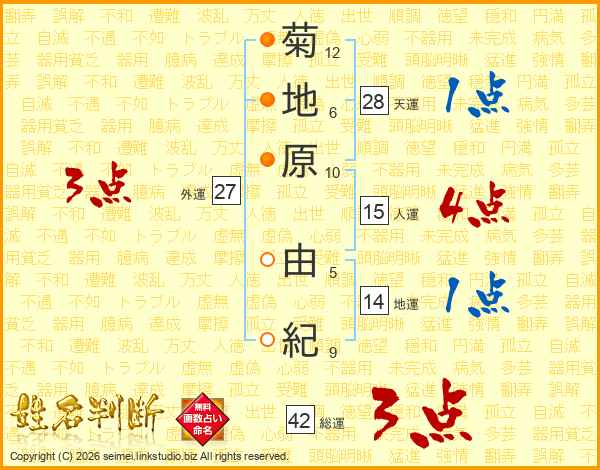 菊(12画)地(6画)原(10画) 由(5画)紀(9画)