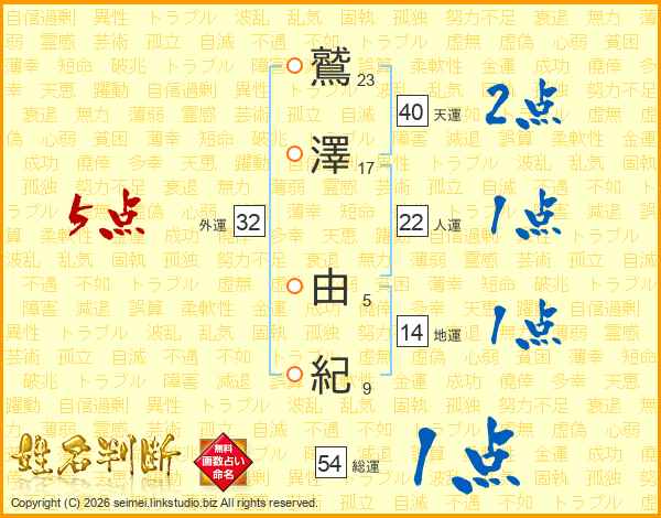 鷲(23画)澤(17画) 由(5画)紀(9画)