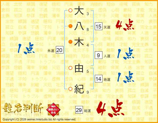 大(3画)八(8画)木(4画) 由(5画)紀(9画)
