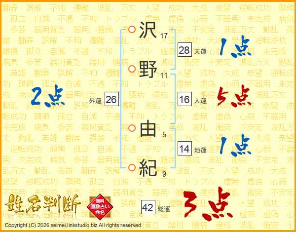 沢(17画)野(11画) 由(5画)紀(9画)