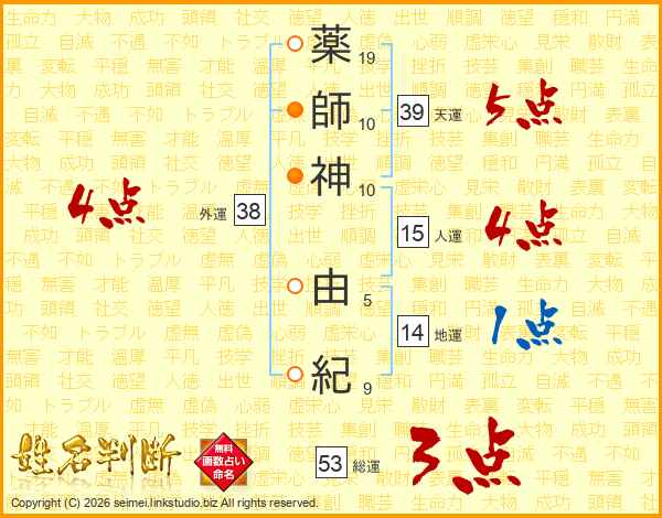 薬(19画)師(10画)神(10画) 由(5画)紀(9画)