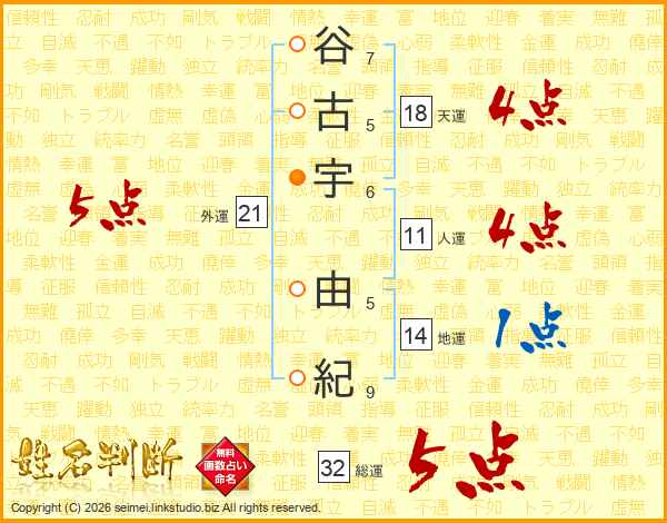 谷古宇由紀さんの総運は32画の5点!