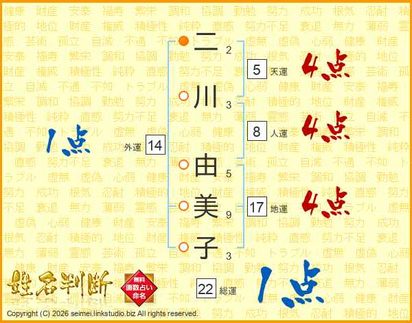 生活面を象徴する運勢です。外部から受ける影響力を表し、結婚運、家庭運や職場、環境への順応性を表します。総運から人運を引いた画数。姓や名が1文字の場合を除く。