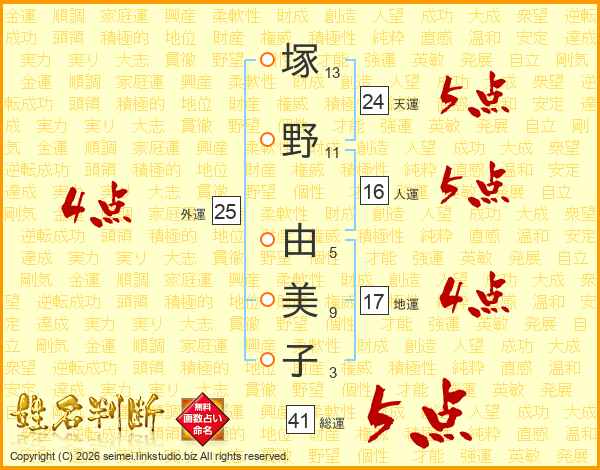 塚(13画)野(11画) 由(5画)美(9画)子(3画)