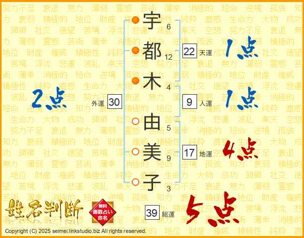 宇(6画)都(12画)木(4画) 由(5画)美(9画)子(3画)