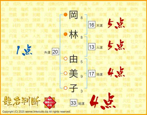 岡(8画)林(8画) 由(5画)美(9画)子(3画)