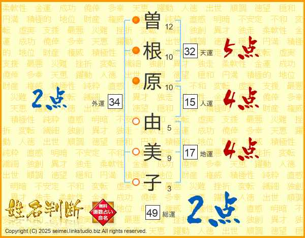 曽(12画)根(10画)原(10画) 由(5画)美(9画)子(3画)