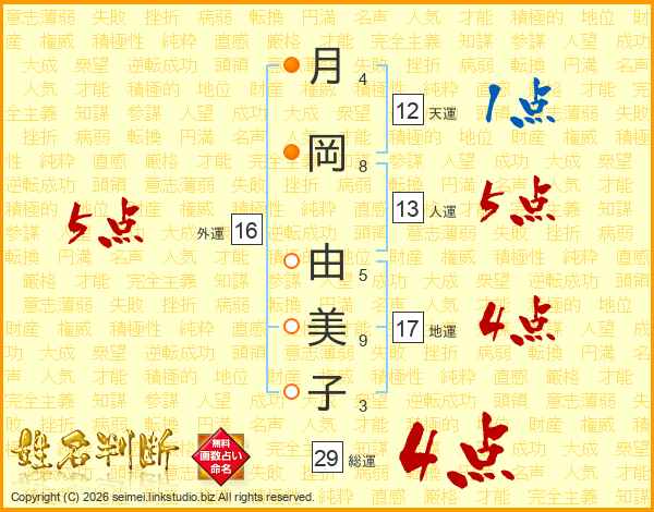 月(4画)岡(8画) 由(5画)美(9画)子(3画)