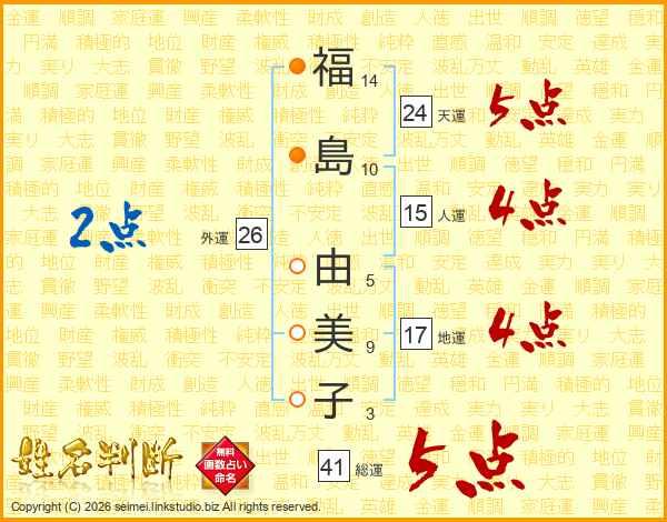 福(14画)島(10画) 由(5画)美(9画)子(3画)