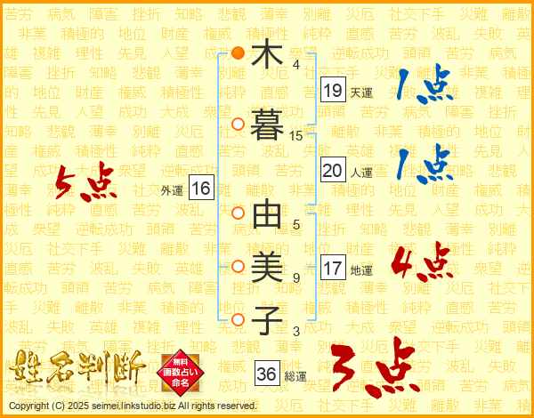 木(4画)暮(15画) 由(5画)美(9画)子(3画)