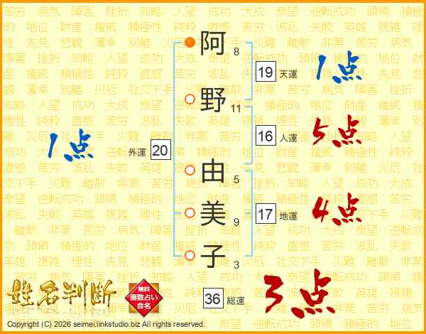 阿(8画)野(11画) 由(5画)美(9画)子(3画)
