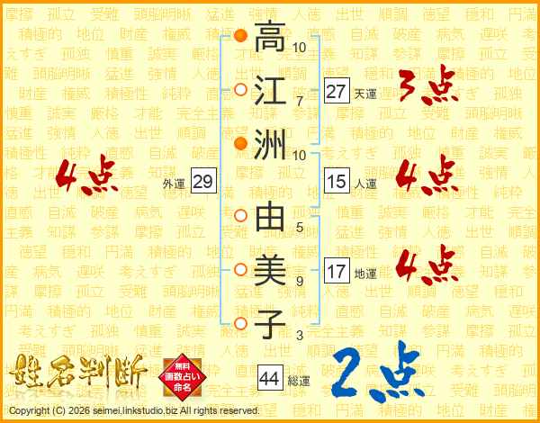 高(10画)江(7画)洲(10画) 由(5画)美(9画)子(3画)