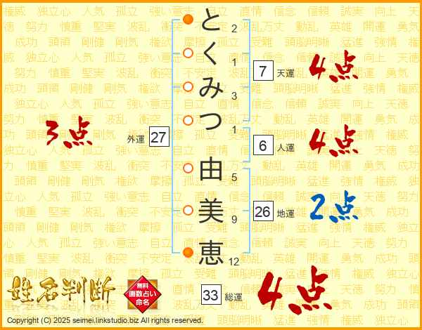 と(2画)く(1画)み(3画)つ(1画) 由(5画)美(9画)恵(12画)