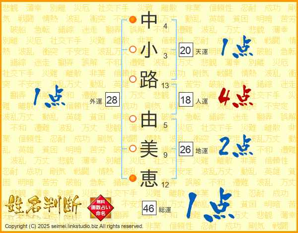 中(4画)小(3画)路(13画) 由(5画)美(9画)恵(12画)
