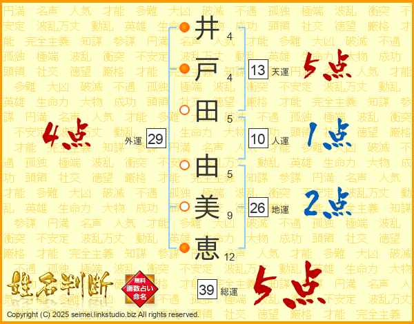 井(4画)戸(4画)田(5画) 由(5画)美(9画)恵(12画)