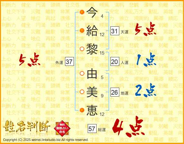 今(4画)給(12画)黎(15画) 由(5画)美(9画)恵(12画)