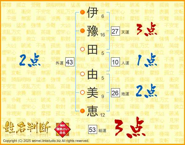 伊(6画)豫(16画)田(5画) 由(5画)美(9画)恵(12画)