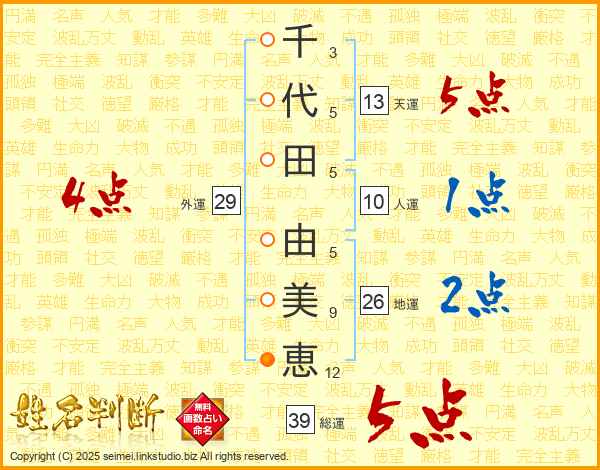 千(3画)代(5画)田(5画) 由(5画)美(9画)恵(12画)