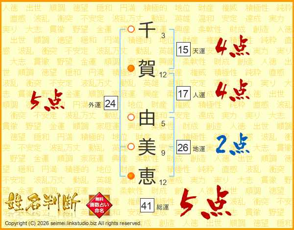 千(3画)賀(12画) 由(5画)美(9画)恵(12画)