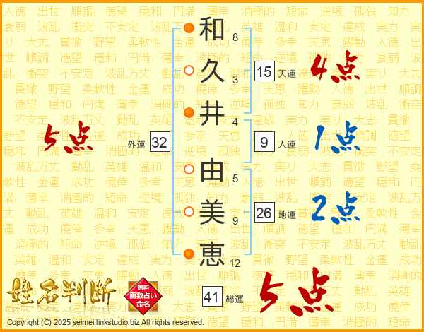 和(8画)久(3画)井(4画) 由(5画)美(9画)恵(12画)