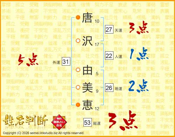 唐(10画)沢(17画) 由(5画)美(9画)恵(12画)